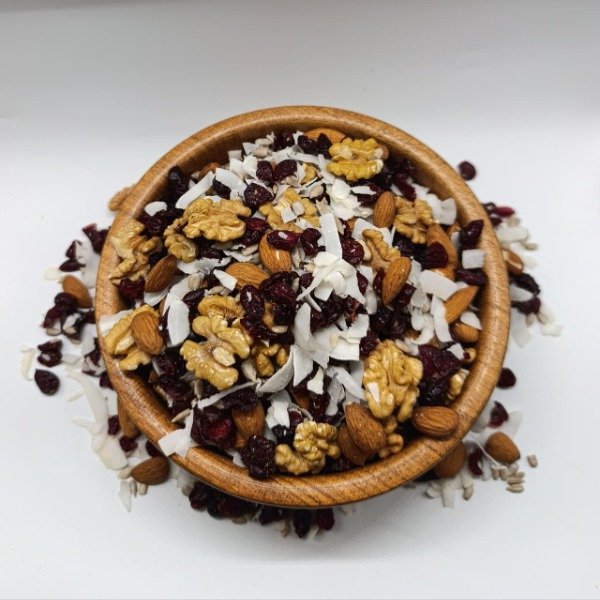 Arándanos, nueces mariposas, almendras, coco en escamas y semillas de girasol