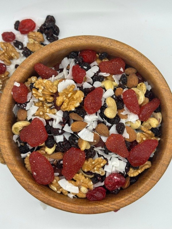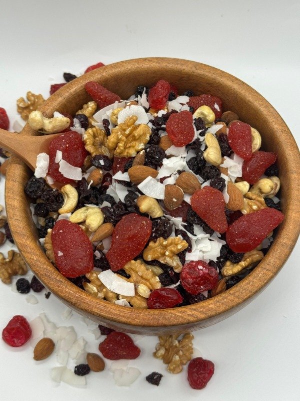 PASAS MOROCHAS, NUECES, CASTAÑAS, ALMENDRAS, COCO EN ESCAMAS, CEREZAS, ARANDANOS, FRUTILLAS
