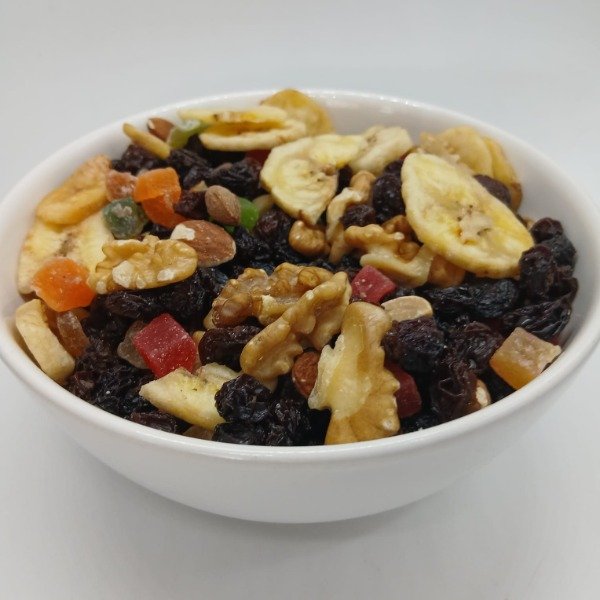 PASAS DE UVA MOROCHAS, NUECES, ALMENDRAS, ANANA EN CUBOS Y BANANA